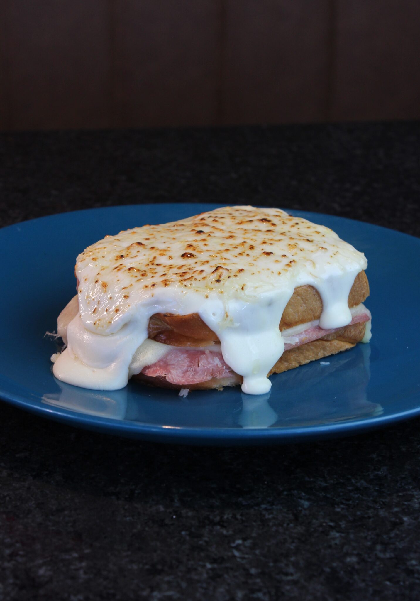 Pão brioche com molho bechamel, queijo mussarela, presunto.